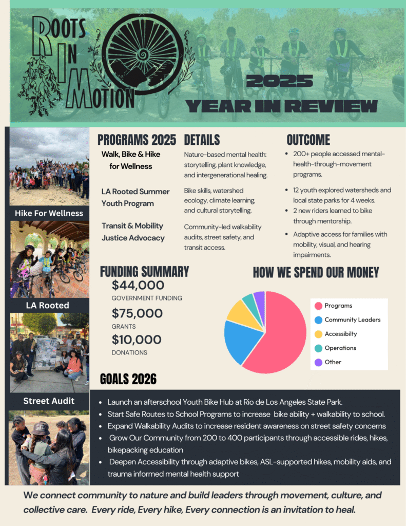 Roots In Motion (RIM) cultiva la salud y la resiliencia intergeneracional en comunidades racializadas de bajos ingresos mediante aventuras al aire libre y actividades basadas en el movimiento. Como parte de Karmic Action Retribution Management Agency, RIM celebra la diversidad de identidades y herencias ancestrales, creando programas empoderadores que fomentan el bienestar, la creatividad y la conexión comunitaria. Desde 2013, ofrecemos iniciativas durante todo el año, como campamentos juveniles, excursiones en bicicleta y excursiones de mochilero, que brindan espacios para el desarrollo personal y la conexión con la naturaleza.